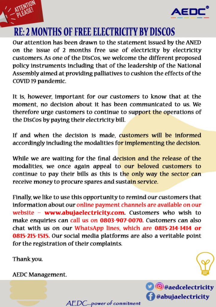 Other 2 months of free electricity by discos Posted by samirah April 13, 2020 samirah Leave a Reply Cancel replyYour email address will not be published. Required fields are marked *Comment * Name * Email * Website Save my name, email, and website in this browser for the next time I comment.